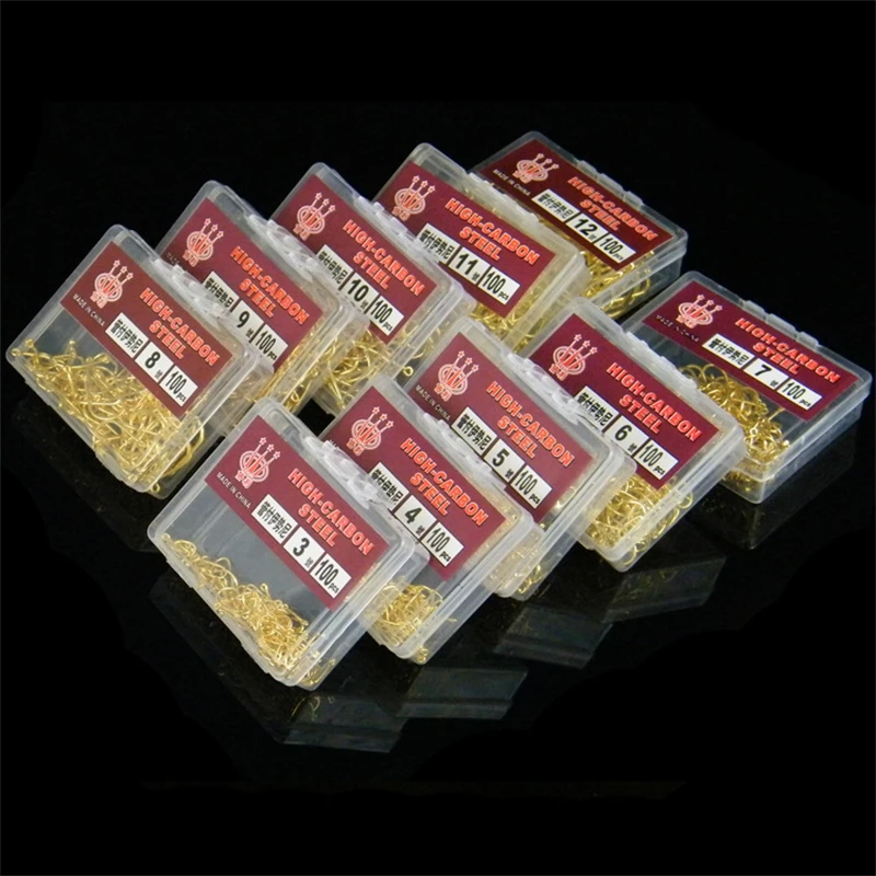 100 قطعة/الوحدة عالية الكربون الصلب 3 # -12 # خطافات صيد السمك الذهبية خطافات صيد السمك خطاف شائك مع فتحة ملحقات صيد السمك Pesca