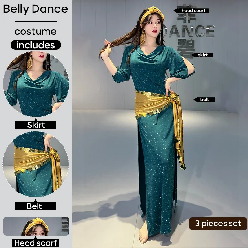3 قطعة مجموعة وشاح الرأس حزام وتنورة ملابس رقص البطن مثير بدلة ممارسة الملابس للنساء البالغات مرحلة الأداء