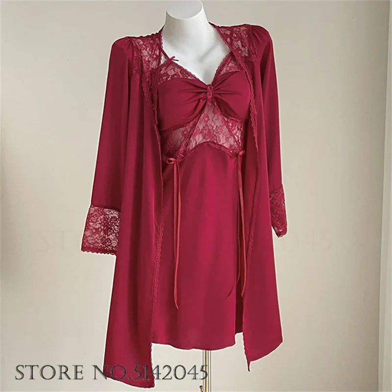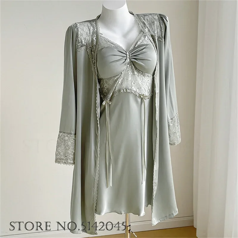 إغراء الدانتيل ثوب النوم مثير الإناث نايتي و رداء مجموعة الملابس الداخلية الحرير الساتان البشكير ملابس خاصة الصيف Homewear