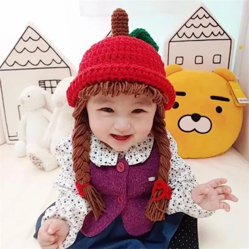 الأحمر التفاح شكل تأثيري طفلة قبعة بحافة الشعر جديلة شعر مستعار قبعة الشتاء الدافئة محبوك الأطفال أطفال بنات القبعات قبعات اكسسوارات