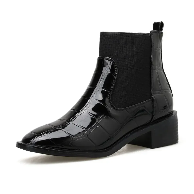 المرأة جولة تو كتلة كعب منخفض تشيلسي الأحذية السوداء الانزلاق على براءات الاختراع والجلود حذاء من الجلد أحذية مريحة عدم الانزلاق