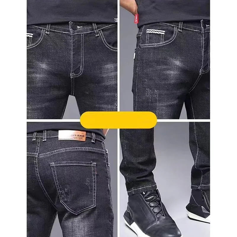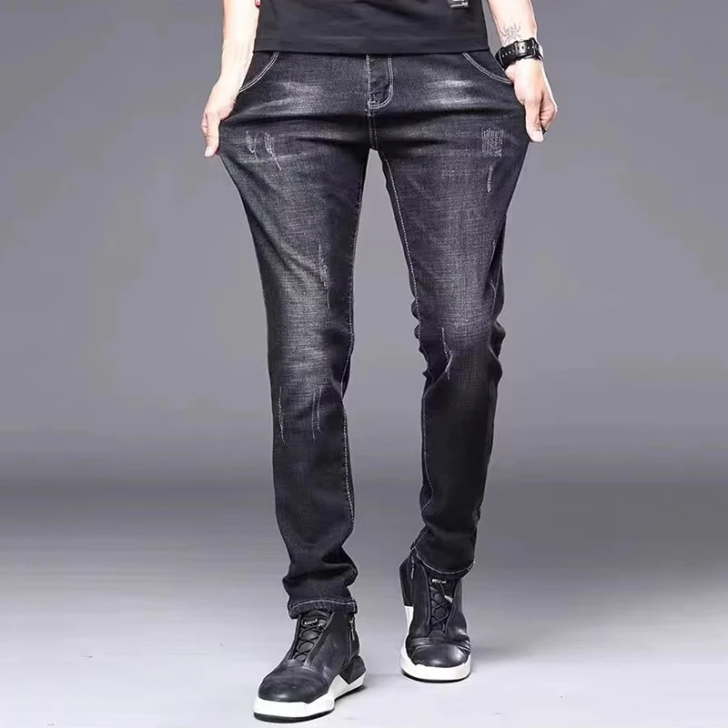 الرجال أنيق كلاسيكي الأعمال جينز غير رسمي أربعة مواسم ارتداء السراويل السوداء الزرقاء منتصف الخصر طماق الدنيم النسيج السراويل الذكور