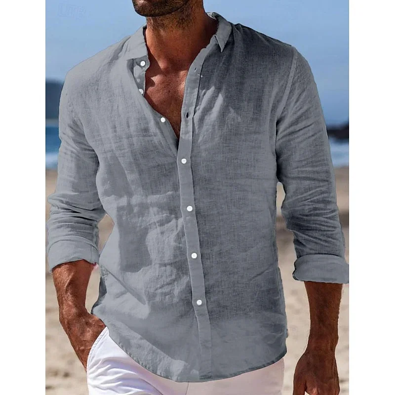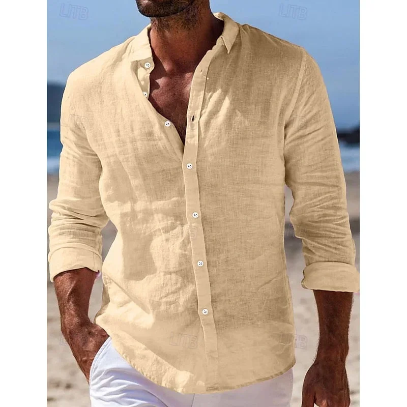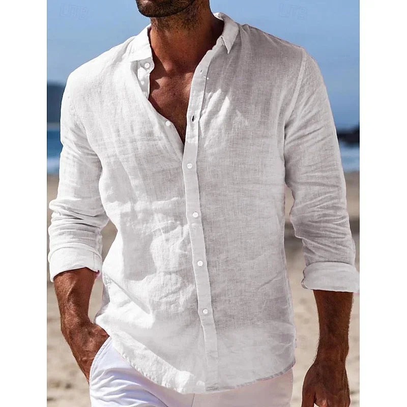 الرجال قميص كتان الصيف قميص الشاطئ زر بلون عادية يوميا أسود أبيض وردي أزرق كحلي طية صدر السترة بأكمام طويلة XS-6XL