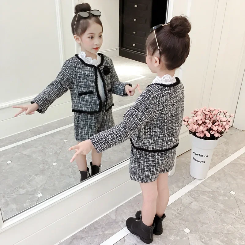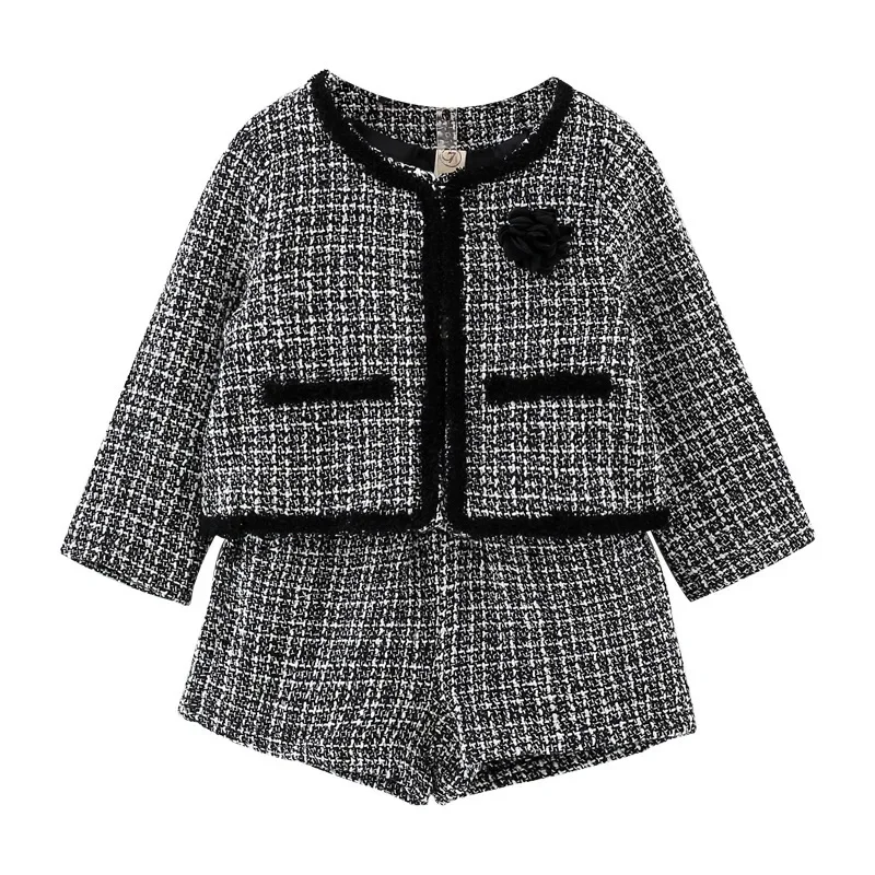 أنيقة تويد نمط الأطفال البدلة سترة السراويل 2 قطعة مجموعة الأزياء الكورية لربيع الخريف ملابس الاطفال