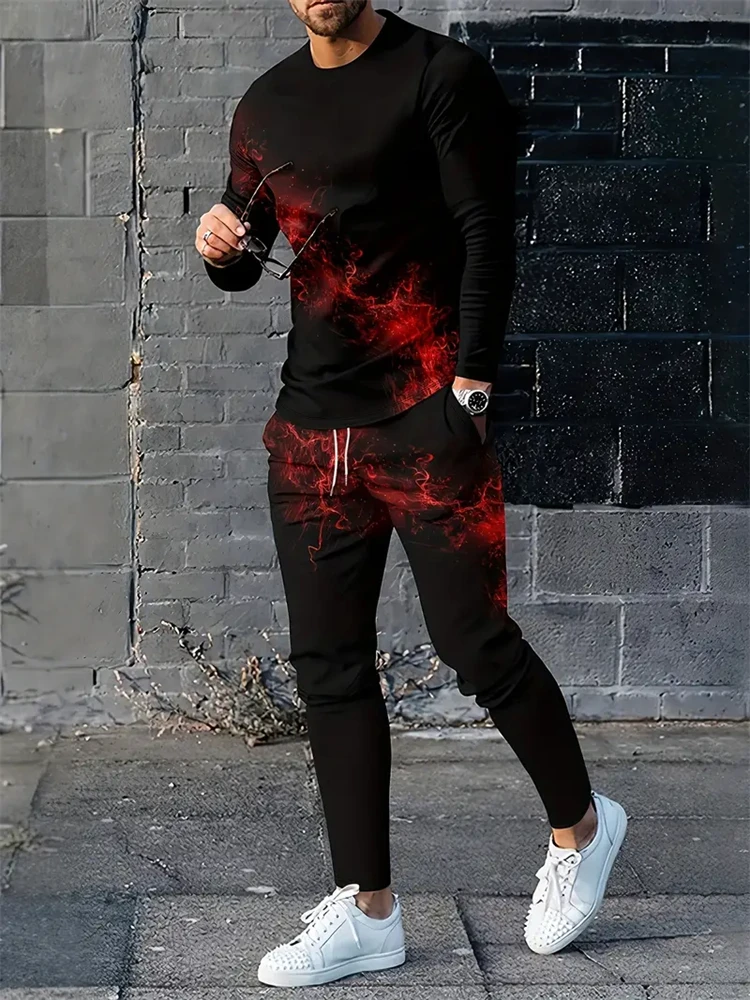 بدلة رياضية للرجال ثلاثية الأبعاد بطبعة لهب أزرق من قطعتين ، رقبة مستديرة ، أكمام طويلة ، بنطال رياضي ، ملابس رجالية ، موضة