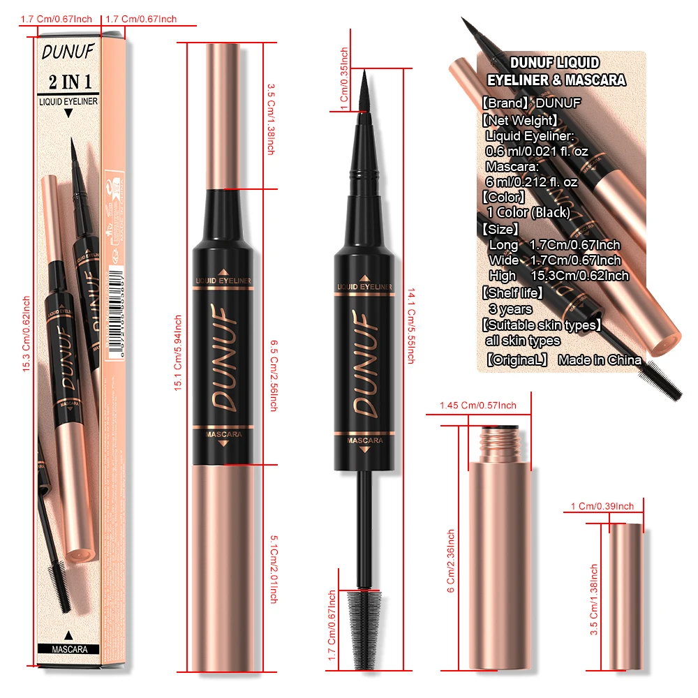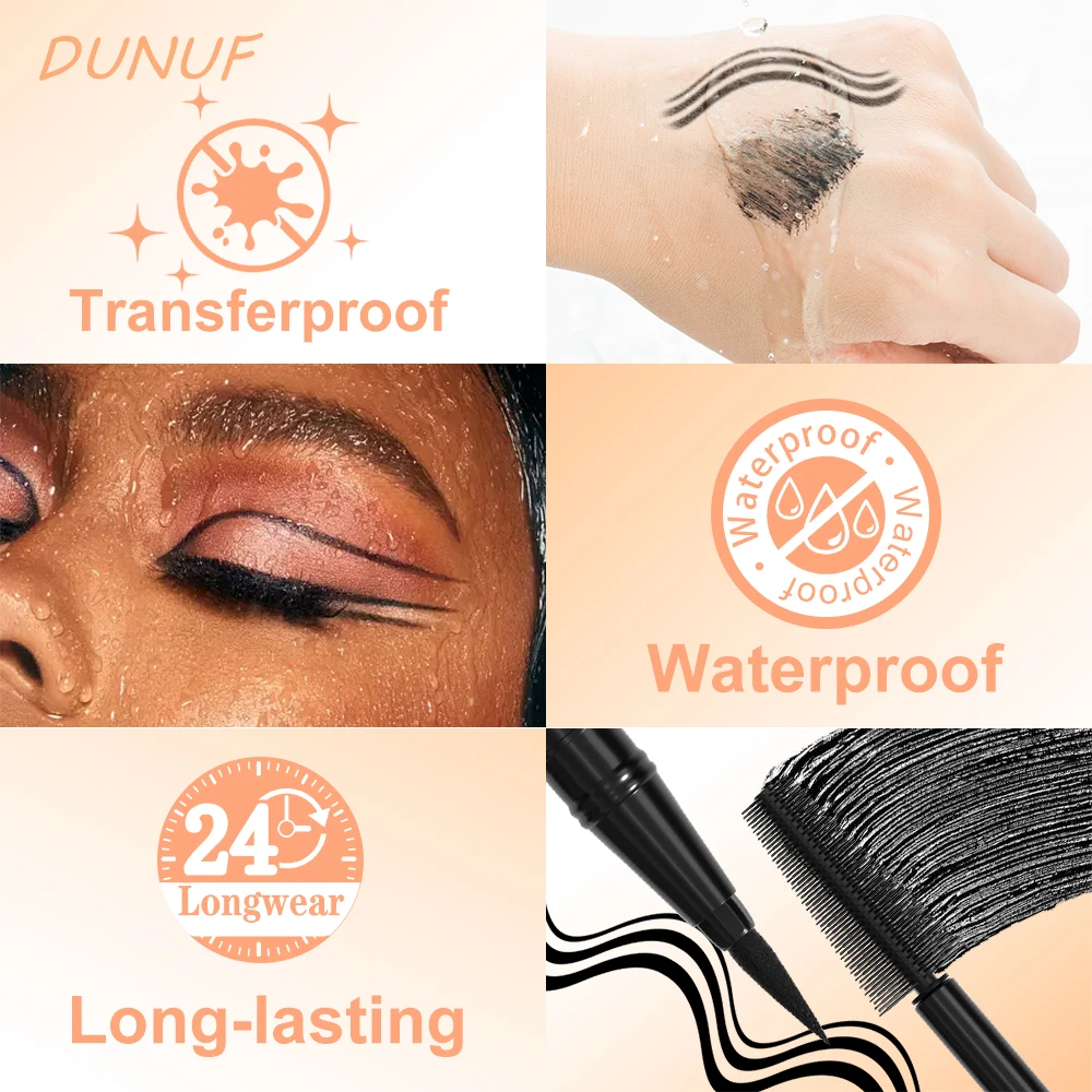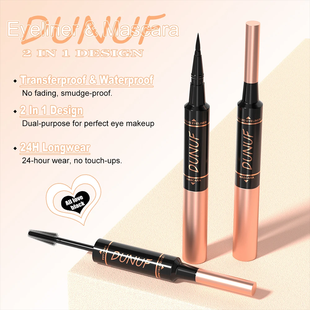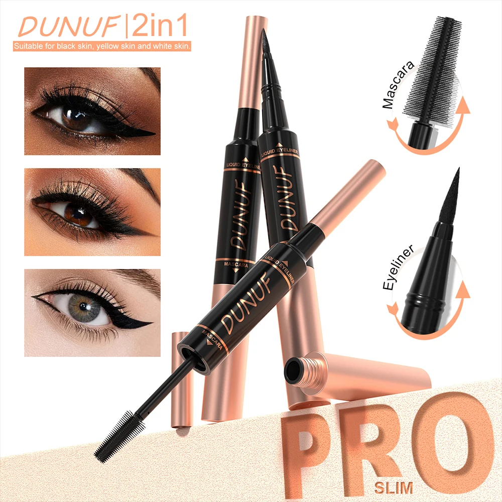 DUNUF ماسكارا مفردة + محدد عيون 2 في 1 محدد عيون طويل الأمد مقاوم للماء ومقاوم للعرق مع تجعيد طويل وحجم
