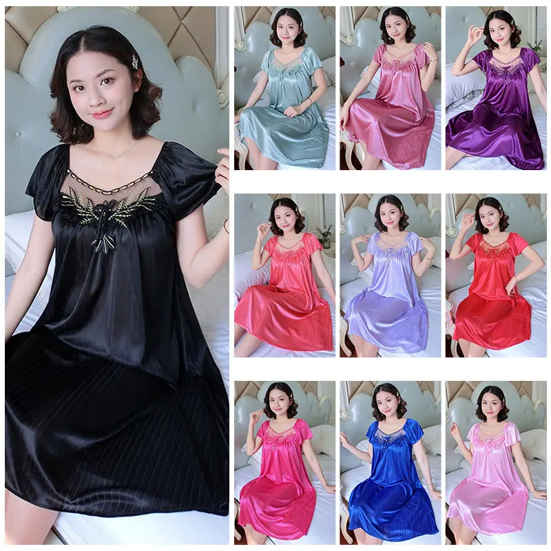 فستان نوم نسائي ملابس نوم للسيدات من الحرير الجليدي فستان نوم متوسط الطول بأكمام قصيرة ملابس منزلية بيجامة ملابس نوم