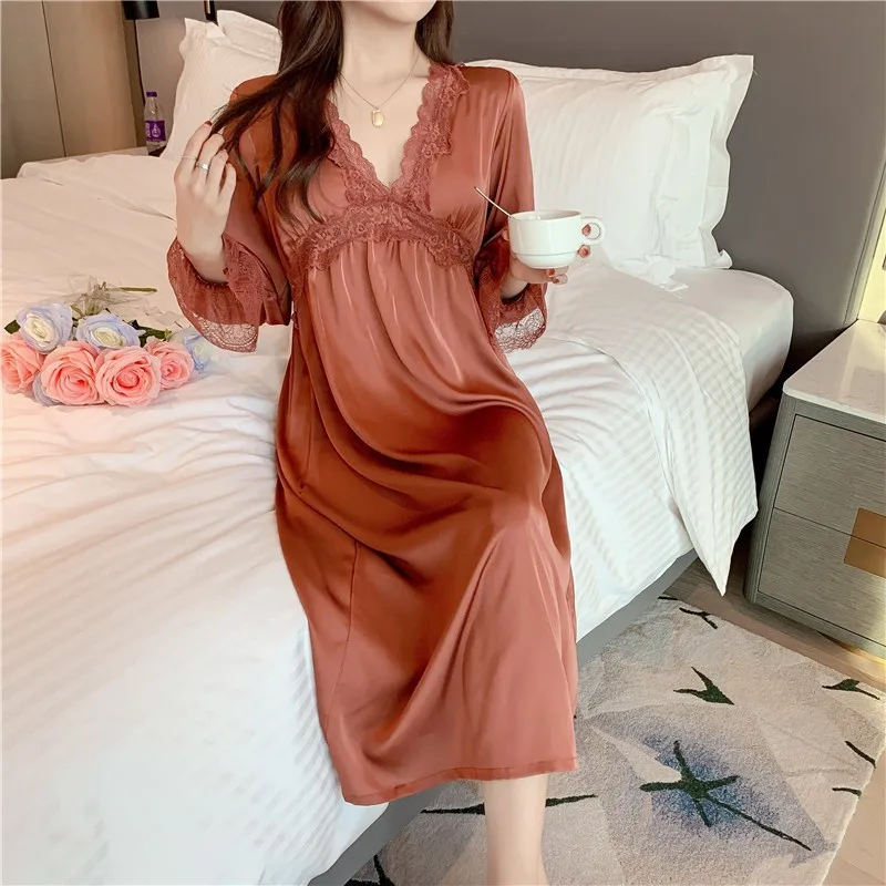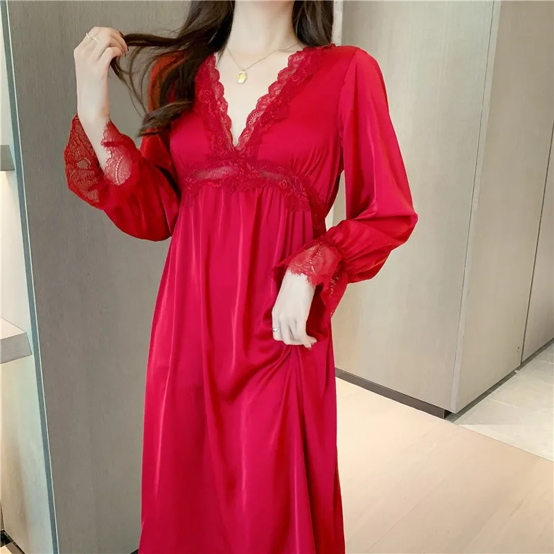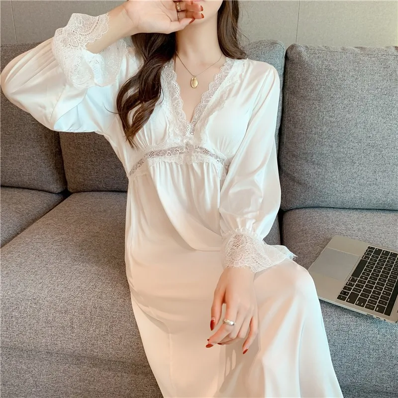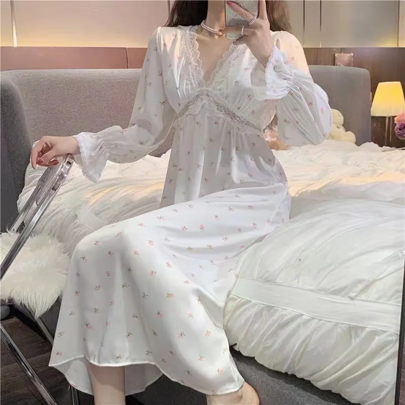قمصان نوم بتصميم أنيق للنساء لربيع الخريف بأكمام طويلة، ملابس نوم على طراز الأميرة الفرنسية مع وسادة صدر للسيدات