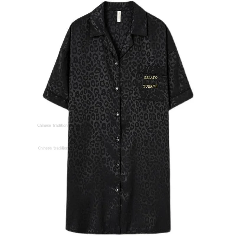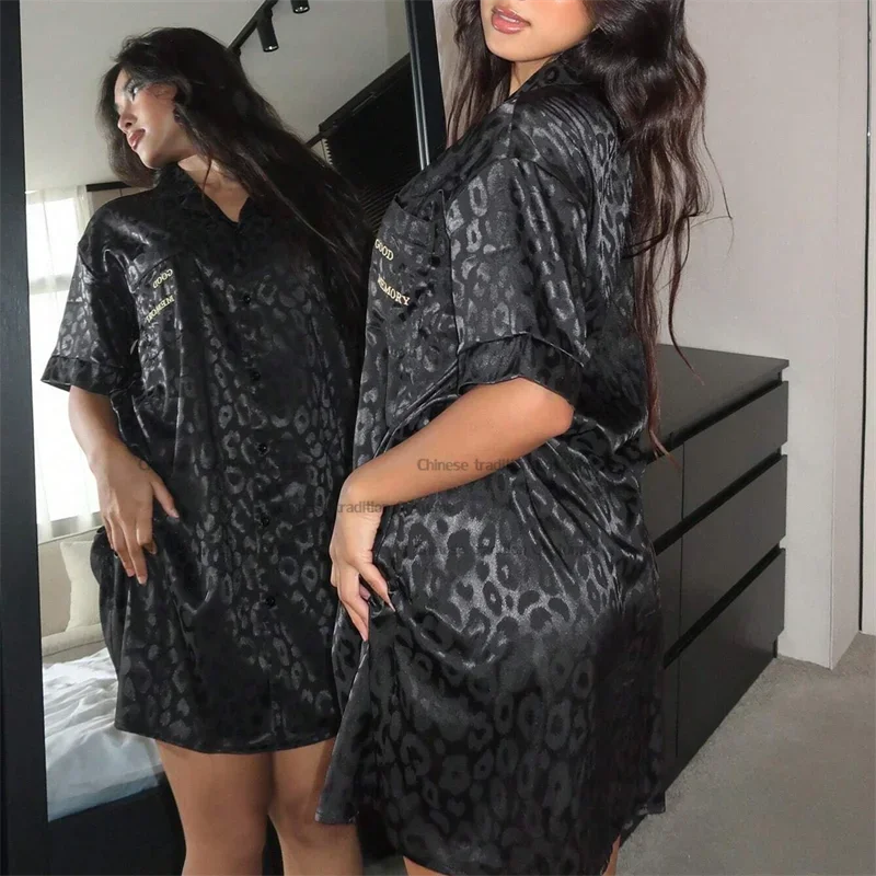 ملابس نوم نسائية من قماش الجاكار الساتان الفهد ثوب نوم مثير على طراز القميص مقاس كبير 3Xl 4Xl 5Xl فستان نوم صيفي جديد بيجاما موجر