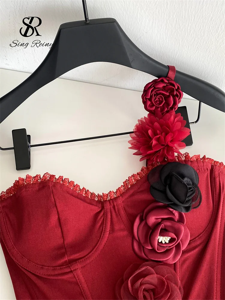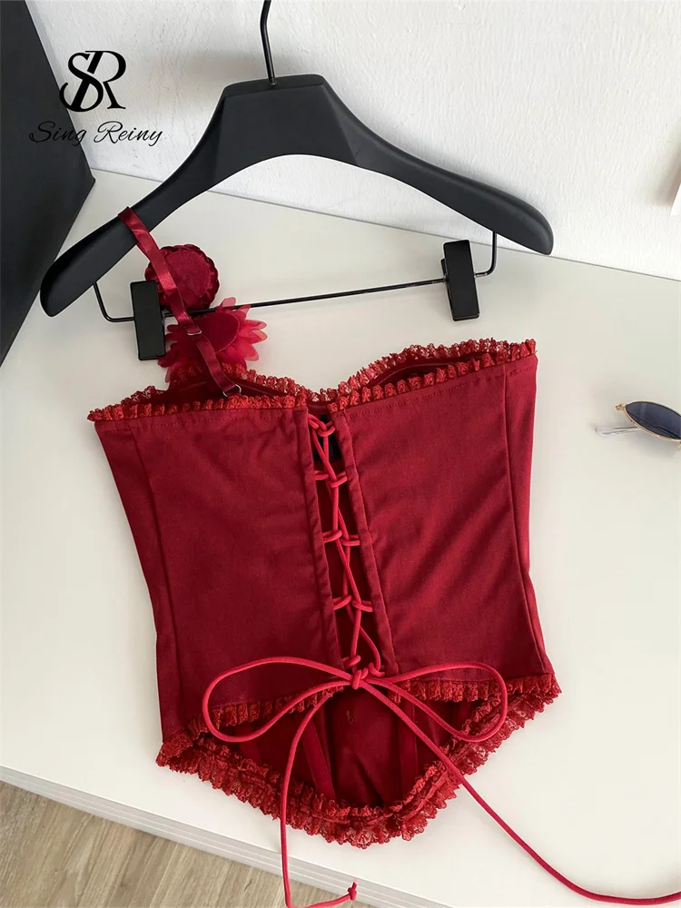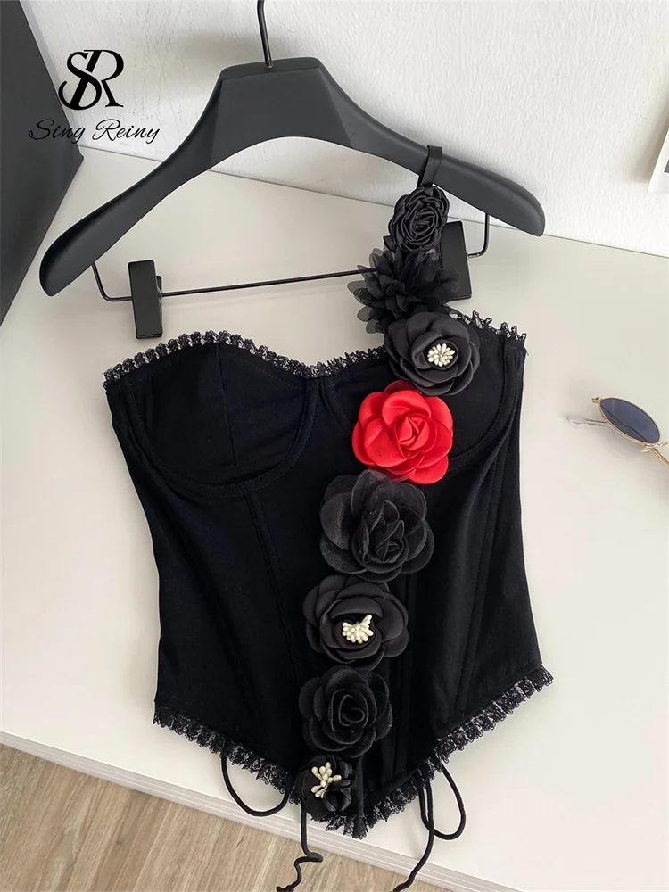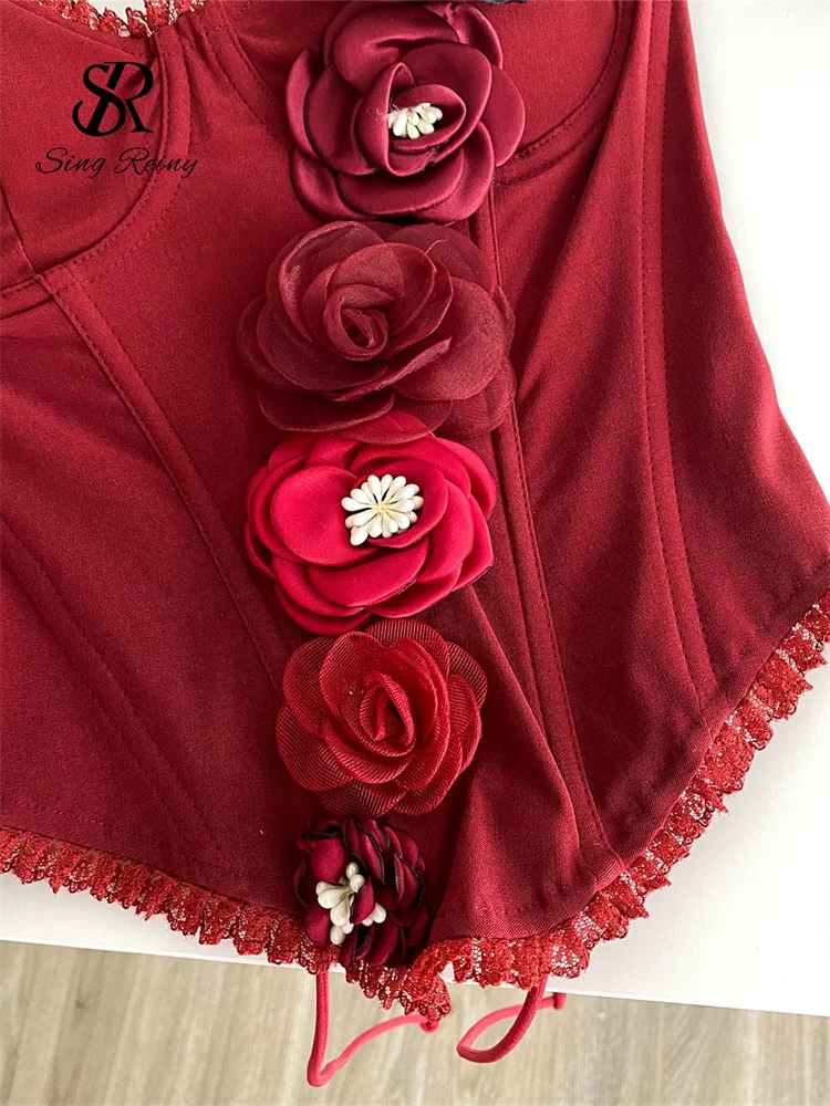 SINGREINY ثلاثية الأبعاد الأزهار حفلة تانك القمم حزام الإناث الكشكشة تقسم الدانتيل يصل سليم الملابس الداخلية أعلى مشد عالي الجودة مثير بروتيل