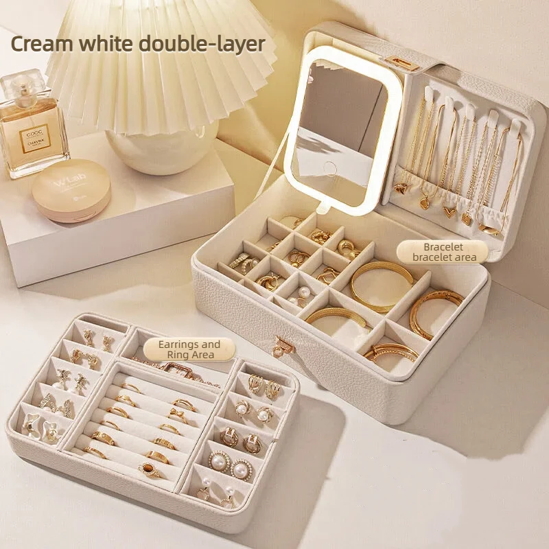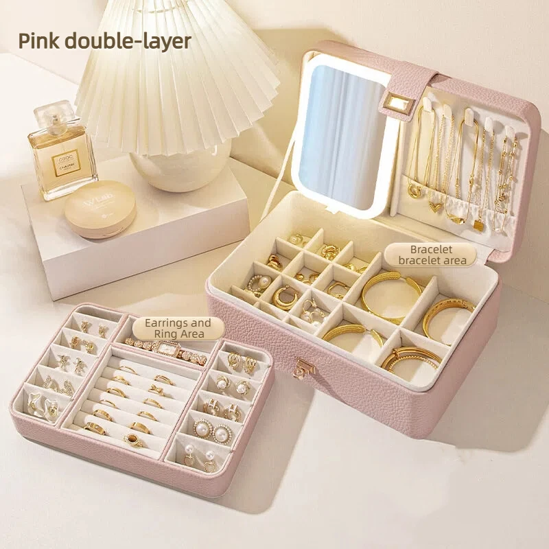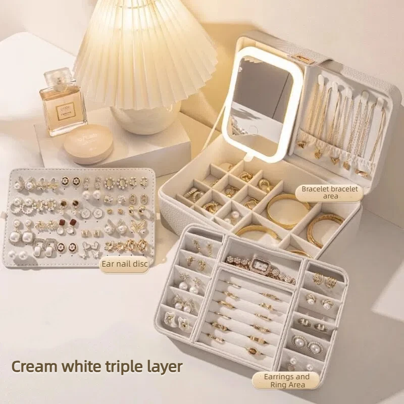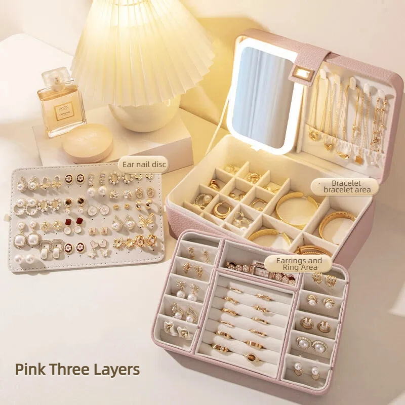 صندوق مجوهرات عالي الجودة مضاد للأكسدة متعدد الطبقات ذو سعة كبيرة مع مرآة مكياج للأقراط والخواتم والقلائد