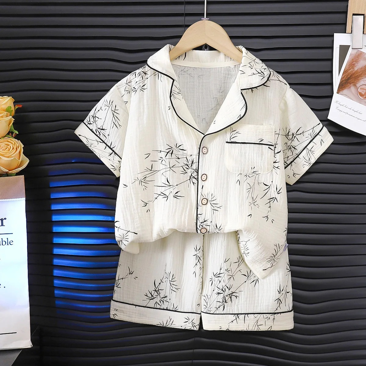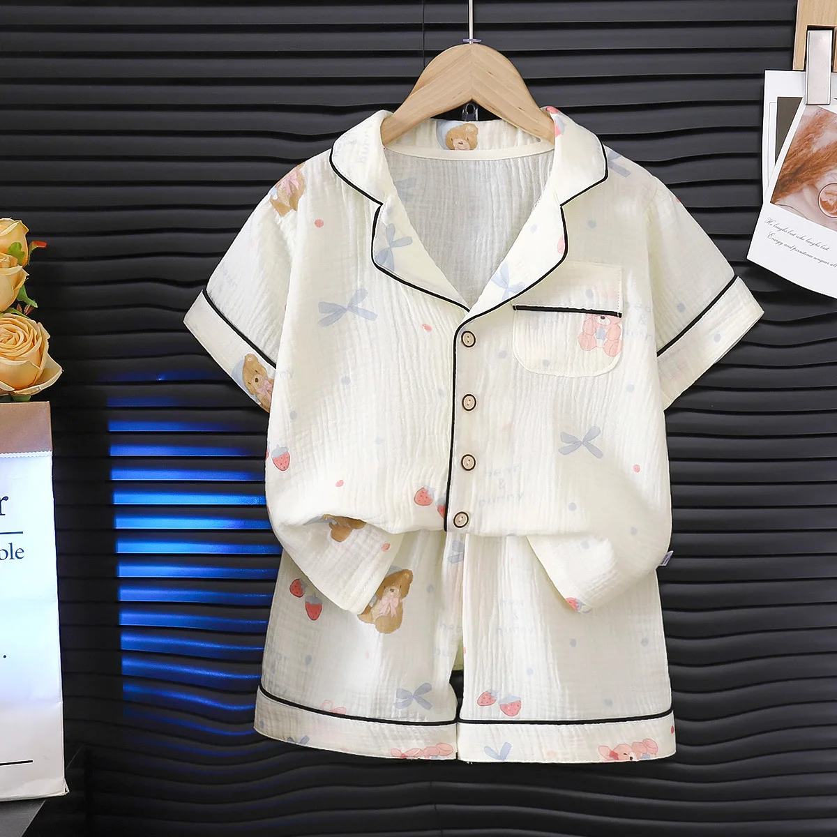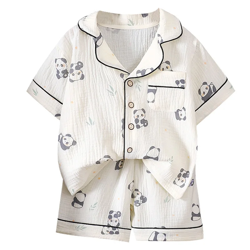 طقم بيجامة صيفية للأطفال بياقة رفيعة وأكمام قصيرة للأولاد والبنات، طقم بدلة منزلية من الشاش بطبقة مزدوجة من الدرجة A