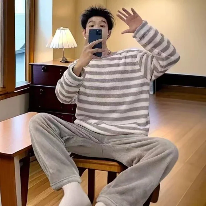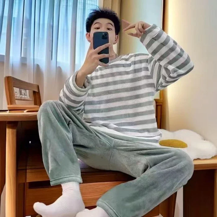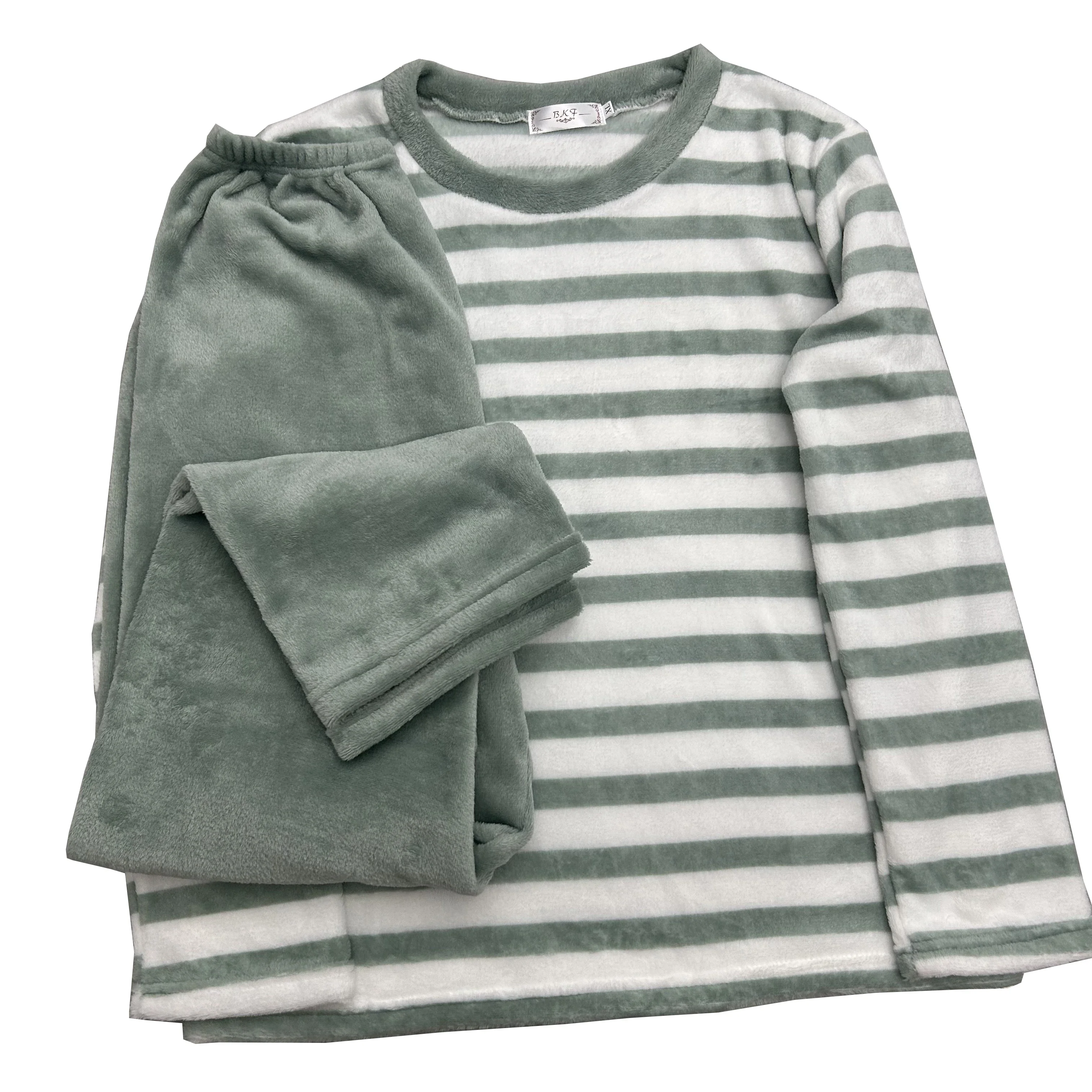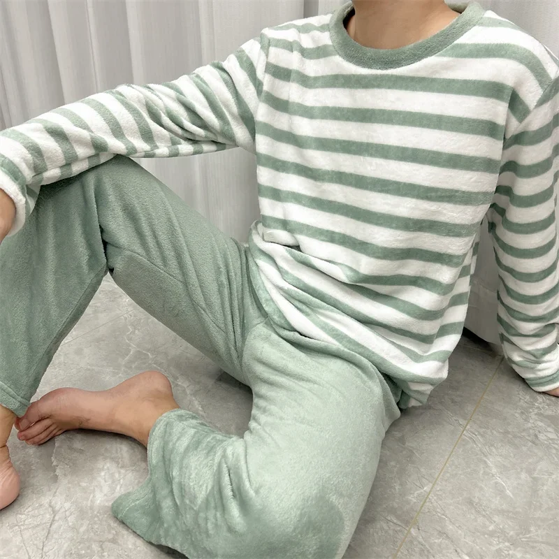 طقم بيجامات رجالي من الفلانيل طقم بيجامات من الصوف المرجاني الفرنسي برقبة دائرية طقم بيجامات مخملية شتوية مخططة باللون الأخضر