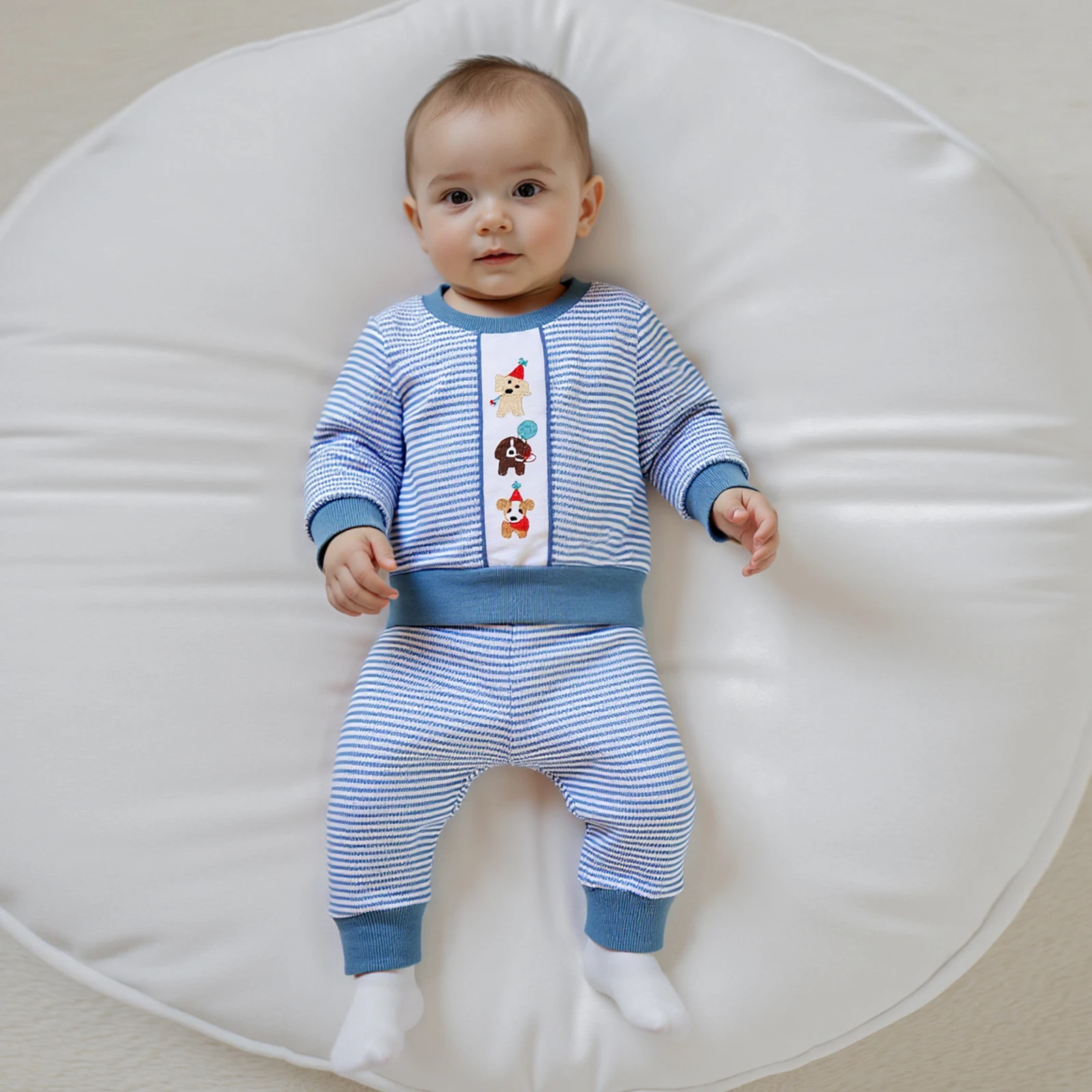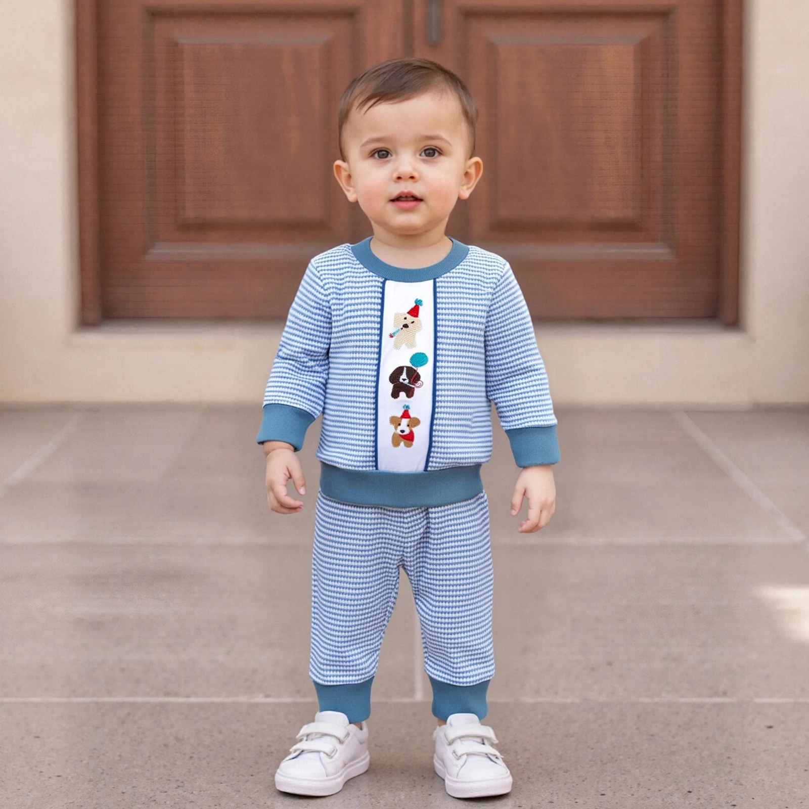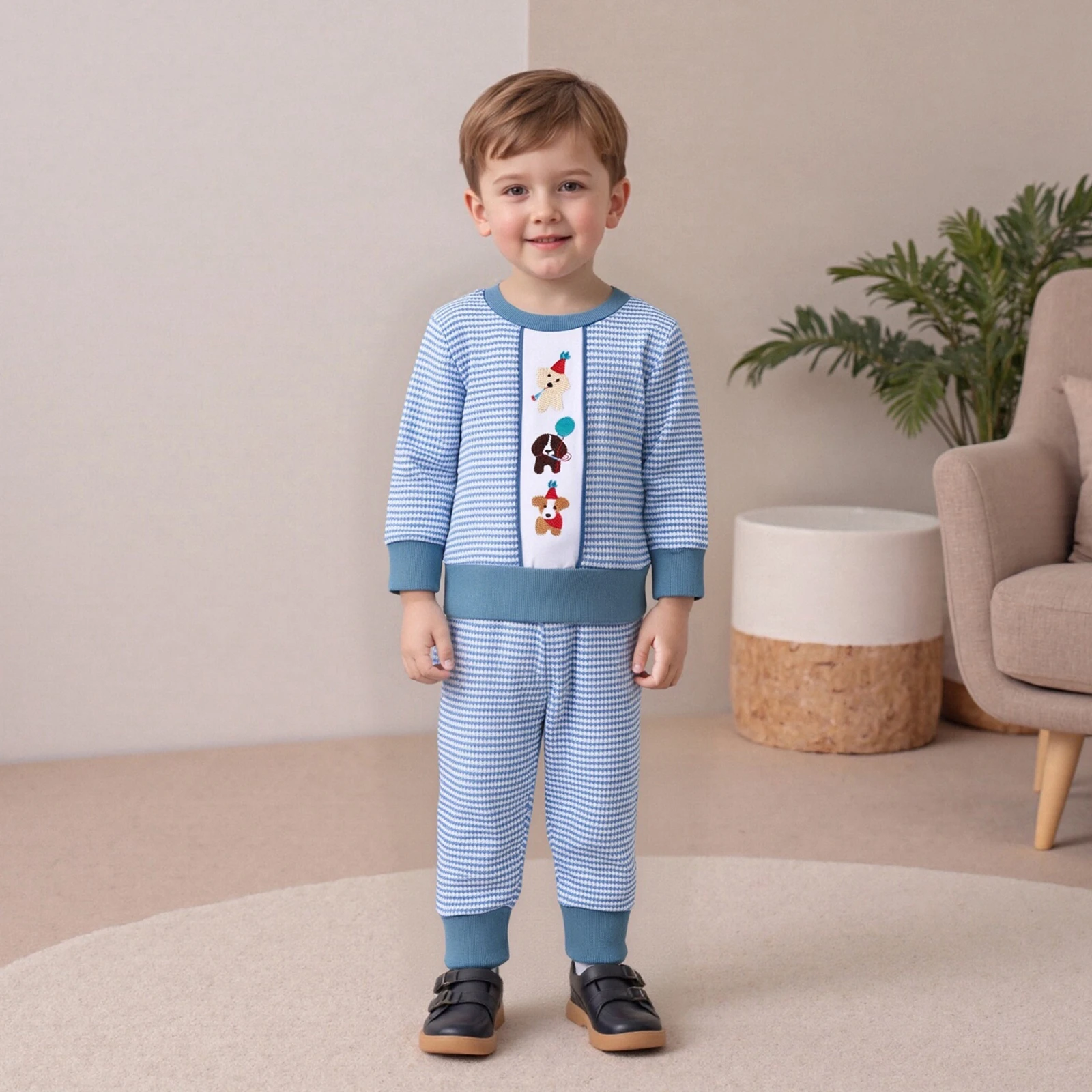 طقم ملابس عيد ميلاد للأطفال الصغار من الأولاد الصغار مطرز بأكمام طويلة ورقبة دائرية وقميص وسروال مخطط